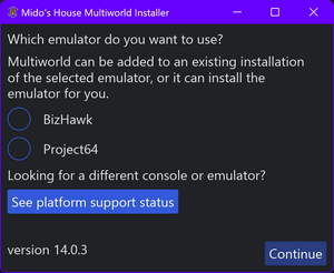 • For emulators, the installer supports both installing multiworld for an existing copy of the selected emulator, as well as installing a new copy of the emulator itself. The choice between these two modes is made on the next page.